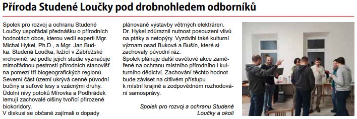 Jen dodejme, že ve své snaze nezůstal osamocený. Obdobný návrh zastupitelům zaslal i Spolek pro rozvoj a ochranu Studené Loučky a okolí, který z iniciativy místních občanů mezitím vznikl. Ano, stále platí omšelé "všechno zlé je pro něco dobré", protože hrozba toho, že někdo jiný rozhodne o osudech místních, o devastaci prostředí, ve kterém žijí, že někdo umožní realizovat investorovi jeho byznys přes ohrožení zdraví lidí, přírody a krajiny, že namísto dalšího rozvoje a zvelebování přijde degradace celého území, vyvolala nebývalou aktivitu místních. Společné ohrožení vyneslo na povrch společné zájmy. Najednou je čím dál méně lidí, které znáte jen od vidění, ale již jsou to skuteční sousedé, kterým stejně jako vám záleží na dříve nepojmenovaných věcech, chtějí se sdružovat, sami pro dobrou věc něco udělat, přijít s novou aktivitou. Jako by si více uvědomili, že o svou vesnici tak, jak ji znají, nechtějí přijít a že jejich svět nekončí za jejich soukromým plotem. Za ten rok odporu, seznamování se s technickými podrobnostmi a legislativou, pročítání odborných posudků, konzultací s odborníky, komunikace s úřady, vysvětlování zastupitelům, bohužel i vyvracení nesmyslů a snášení ne vždy korektního jednání, rozsáhlých diskusí a vzájemného sdílení všech těchto informací, už ví své. Vědí, co chtějí a co ne.